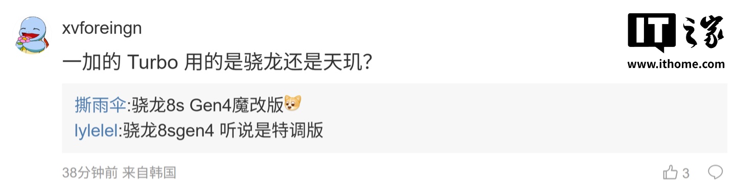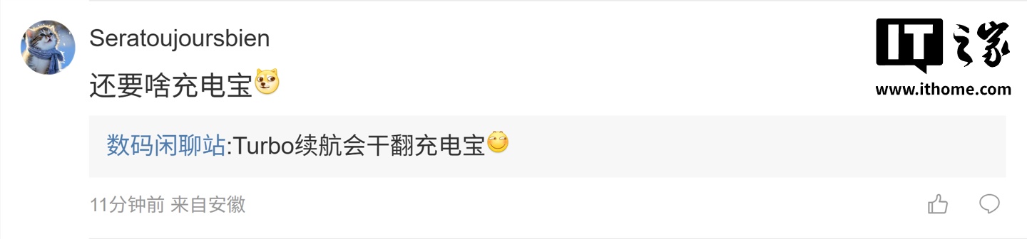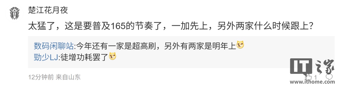 后续有用户在评论区询问:“太猛了,这是要普及 165 的节奏了,一加先上,另外两家什么时候跟上?”,博主回复道:“今年还有一家是超高刷,另外有两家是明年上 [狗头斜眼]”;另一名用户则表示:“还要啥充电宝 [狗头斜眼]”,博主则回复道:“Turbo 续航会干翻充电宝 [滑稽]”。