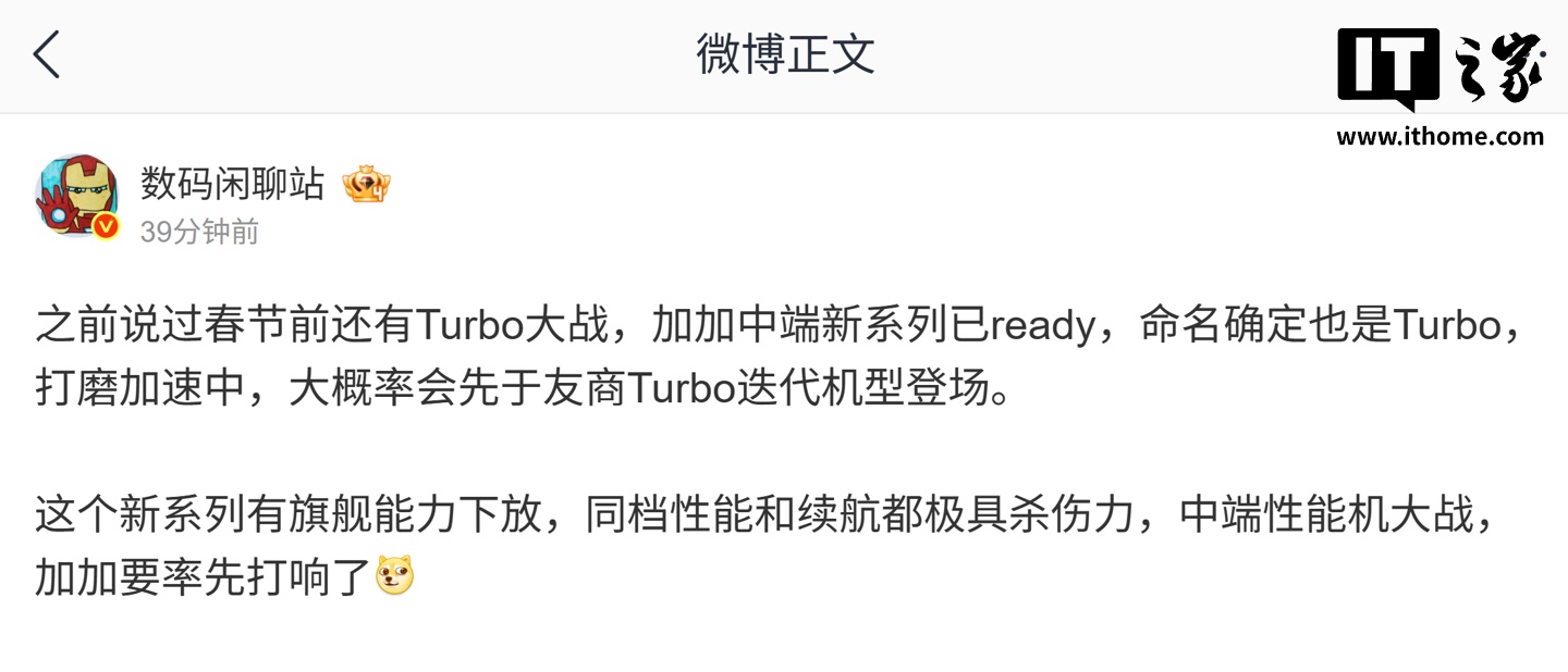 博主表示,该系列机型命名已确定为 Turbo,目前正在加速打磨,大概率会先于友商 Turbo 迭代机型登场,预计将下放“旗舰能力”,性能和续航在同档位都“极具杀伤力”,号称“率先打响中端性能机大战”。